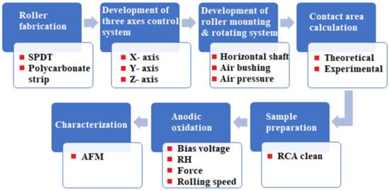 This paper aims to establish a new cost-effective nanoelectrode lithography technique and its test-bed for large-area nanofabrication. We propose a rolling nanoelectrode lithography (R-NEL) process, which could significantly improve the pattern transfer uniformity. This method can be advantageous as it enables continuous patterning and easy de-molding in large-area nanofabrication. The roller-based nanopatterning concepts are not new, they have been successfully utilized in thermal/UV nanoimprint lithography techniques for large-area nanofabrication [22,23,24,25,26]. These roller-based manufacturing methods have been recognized to be a high-throughput and low-cost technology. These methods can even fabricate continuous nanopatterns, which make them attractive for various industrial applications [27,28]. However, the application of a roller in NEL is rare due to the challenges in fabricating the conductive roller stamps. In this work, we will implement the proposed R-NEL system and perform the oxidation process on a Si (100) specimen. We will also investigate the influence of experimental parameters such as pattern direction, applied voltage, and rolling speed on the R-NEL process.