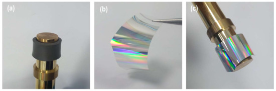 A sequence of process steps was followed to develop a prototype of the R-NEL system (shown in Figure 3). The first step was to fabricate a roller with nano protrusions that can be obtained by several methods. One method is to create patterns directly on the roller surface by diamond turning or electron beam lithography processes. Another way is to wrap a belt or flexible flat stamp around a bare roller. This method is generally the easiest as the belt, or the flexible flat stamp, can easily be fabricated with various patterning techniques. However, wrapping a belt on a roller may leave a seam, which produces an inevitable joint error. In this research, we choose the latter method as it is typically more practical and cost-effective for research purposes. It is also worth noting that a seamless roller stamp should not yield any substantial technical differences, so long as the experimental parameters are the same.