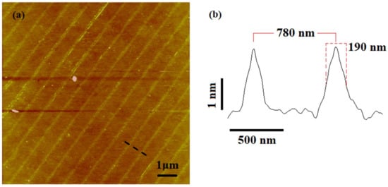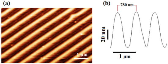 The oxidation processes performed in the previous section used roller stamps where the patterns were orthogonal to the moving specimen direction (Figure 9a). It would be interesting to see how the orientation of patterns affects the oxidation process. To do this, an oxidation experiment was carried out with the same experimental parameters where the patterns were parallel to the moving specimen (Figure 9b). An oxide pattern of 2 nm height and 190 nm FWHM were achieved while maintaining the same periodicity (780 nm) (shown in Figure 10). These oxide patterns were very similar to the pattern obtained with the roller stamp, where the patterns were orthogonal to the moving specimen direction. Therefore, it can be concluded that there is no significant influence of pattern directions on the oxidation process in the R-NEL system.