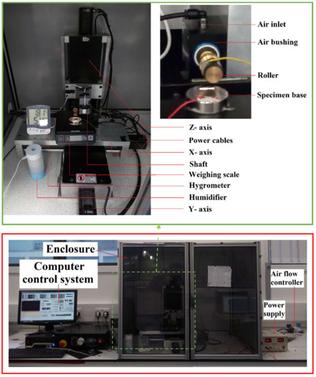 In the next step, an air bushing (13.02 mm inner diameter) with the roller stamp was mounted on the Z-axis of a three-axis translational motion control system. The air bushing distributes compressed air through a tubular media containing millions of sub-micron holes, which holds the roller and enables it to rotate frictionlessly. The specimen was placed on a metal base that can move along the X and Y axes. The motions of these three axes were controlled by a computer, which allowed the correct positioning of the specimen relative to the roller stamp. The roller descended to make gentle contact with the specimen. When the specimen moved along the X-axis, the roller also rotated due to adhesive force at the contact between them. Thus, the roller rolled over the specimen and fabricated the whole specimen surface. A controller was used to maintain a constant airflow at the required pressure. A humidifier was used to maintain the relative humidity inside the enclosure. A hygrometer and a weighing scale were also used to measure the relative humidity and the force applied on the roller, respectively. Figure 6 shows an overview of the implemented R-NEL system.