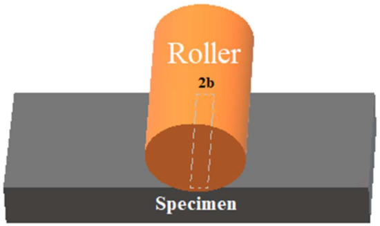 Obtaining a precise contact area between the stamp and the specimen is crucial to determine the rolling speed needed for the oxidation process. The actual contact area during oxidation is only a line or a finite rectangular area along the roller stamp in contact with the specimen, as shown in Figure 7. The size of the contact area, which can be determined by the Hertz theory [29], depends upon some parameters such as the applied force, roller dimensions, and the properties of the roller and the specimen.