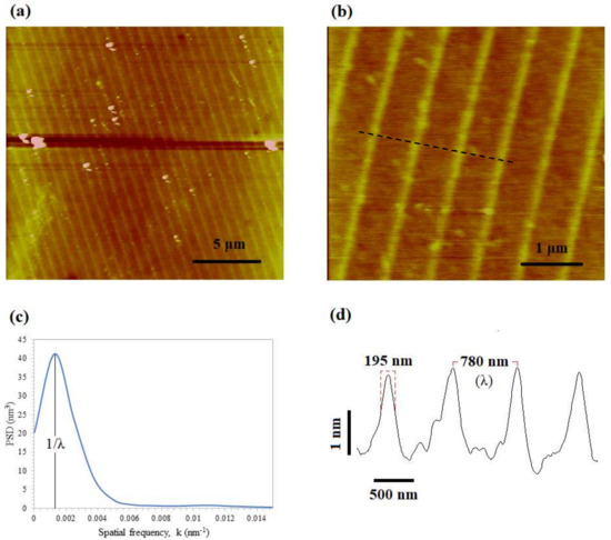 The first experiment was carried out using the roller stamp, where the patterns were orthogonal to the moving specimen direction. Figure 8 shows the result of the oxidation after applying a 1 N force and a voltage of 36 V at a rolling speed of 0.50 mm/min. To characterize the surface morphology, we calculated the power spectral density (PSD) (shown in Figure 8c) and the roughness of the surface by using the characterization methodology proposed in [31]. The characteristic parameters are shown in Table 1. A uniform pattern transfer was achieved with an oxide mean height of 2.1 nm, a full width at half maximum (FWHM) of 195 nm and a periodicity of 780 nm on an area of about 8 mm × 10 mm. The root mean square (RMS) roughness for the oxide lines and the spaces was found to be 217.44 pm and 179.34 pm respectively, while the skewness and the excess kurtosis were estimated as 0.8775 and 0.2828. These results indicate a significant improvement in pattern uniformity compared to the other results obtained with the conventional NEL process [32,33].