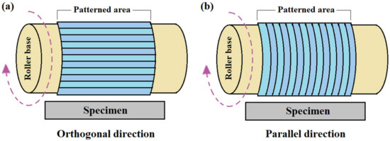 where E1 and E2 are the elastic moduli for the roller stamp, and the specimen and ν1 and ν2 are the Poisson’s ratios, respectively. R is the radius of the roller stamp, and L and F refer to the length of the contact area and the applied force, respectively.