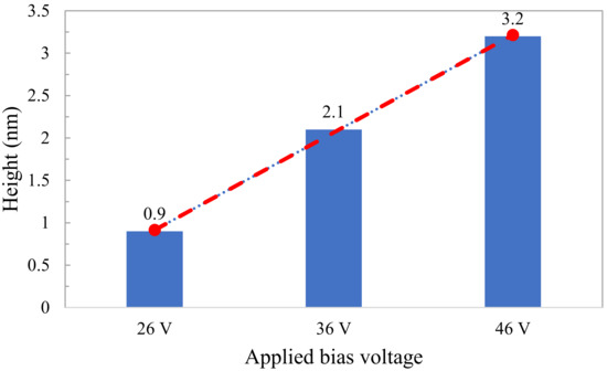 In order to investigate the effect of applied voltage, the oxidation was performed with a bias voltage ranging from 26 to 46 V at a rolling speed of 0.50 mm/min. Figure 12 shows that the oxide height increases linearly with the applied voltage. This outcome is also in good agreement with the results obtained in [37]. Additionally, the aspect ratio (height/width) of the oxide lines is one of the essential factors both in mask fabrication and lithography processes for the semiconductor industry. It was found that the aspect ratio also increases as the rolling speed decreases (from 0.0037 for 1 mm/min to 0.015 for 0.25 mm/min). Therefore, precise control of the aspect ratio of the oxide lines can be achieved by careful optimization of the experimental parameters, such as rolling speed and the applied voltage. Furthermore, the throughput can easily be increased by using a roller stamp with a higher radius.