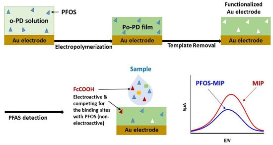 Schematic diagram of molecular imprinting and PFAS detection on a gold electrode. MIP: molecularly imprinted polymer, o-PD: ortho-phenylenediamine, Po-PD: poly(o-phenylenediamine). Adapted with permission from Karimian et al. [78].