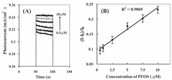 Photocurrent responses of (A) an MIP@TiO2 nanotube arrays (NTA) electrode in 0.1 M PBS (pH 7) solution containing 0.5, 1, 2.5, 5, 7.5, and 10 µM PFOS (from bottom to top). (B) Linear calibration curve. All photocurrents were recorded after the electrodes were immersed in the PFOS solution for 15 min. Reproduced with permission from Tran et al. [81].