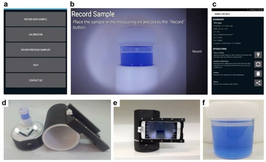 Snapshots (a–c) of the app, photos of the reading kit (d,e), and sample (b,f). In (b), the reading screen’s rectangle zone is positioned over the non-aqueous phase layer and the central part (inner square) is the color reading area. In (d), two white LEDs are on and a container of 25 mL containing the sample is positioned in a sample holder. In (e), the smartphone holder is shown holding a smartphone in the reading position. Note the different orientations (portrait or landscape) of the smartphone in (a–c,e). (For interpretation of the references to color in this figure legend, the reader is referred to the web version of this article). Reproduced with permission from Fang et al. [75].