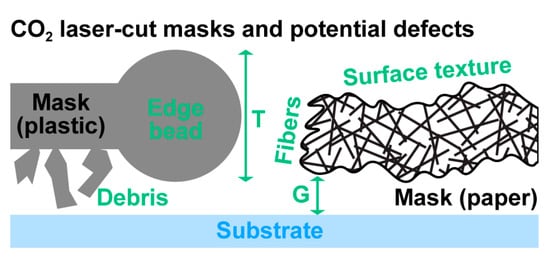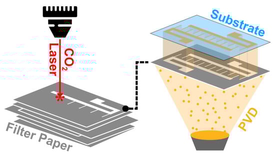 - Fan, Y.; Li, H.; Yi, Y.; Foulds, I.G. Laser micromachined wax-covered plastic paper as both sputter deposition shadow masks and deep-ultraviolet patterning masks for polymethylmethacrylate-based microfluidic systems. J. Micro/Nanolithography MEMS MOEMS 2013, 12, 049701. [Google Scholar] [CrossRef][Green Version]