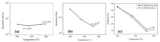 Figure 1a,b shows the influence of annealing temperature on the electrical resistivity of two types of silver films, in which the sample in 25 °C was dried naturally without additional curing and just prepared for comparison (not shown). A digital four-probe tester was used to measure sheet resistance and the electrical resistivity of the films was calculated from the equation of . The silver film in 25 °C was not conductive (not shown), indicating that a large number of organic coatings existed in the silver films. As shown in Figure 1a,b, the lowest electrical resistivity of the silver films based on NP ink (3.7 × 10−8 Ω·m) was larger than that of the silver films based on MOD ink (2.6 × 10−8 Ω·m). The electrical resistivity of two types of silver films both decreased dramatically with the increasing temperature at first because of the evaporation of solvent which was consistent with the decreasing relative carbon content, as shown in Figure 1c. However, when the temperature continued to increase, the electrical resistivity increased slightly. Compared with Figure 2a,c or Figure 2d,f, there were more pores with a large size on the surface of silver films in 200 °C. It indicated that the faster evaporation rate caused more pores in silver films, and a faster curing rate made the silver inks solidify more quickly so that less pores could be eliminated by the flow of liquid inks, which caused a worse mutual contact between the silver particles. On the other hand, the rapid solidification of silver ink resulted in a small amount of organic substances trapped inside silver films, which was consistent with a slightly increasing relative carbon content in 200 °C (Figure 1c). As a result, the electrical resistivity of silver films increased. In addition, we speculated that more pores with a large size existing on the surface of silver film based on NP silver ink than that based on MOD silver ink was due to the removal of organic coatings in 200 °C.