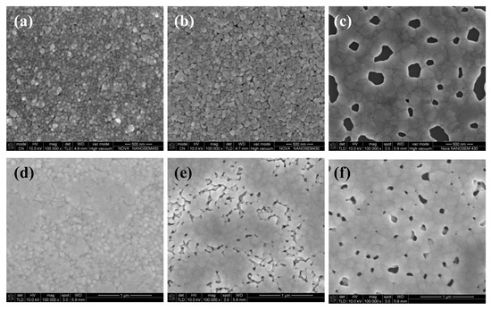 SEM images of heat-cured silver films: Silver films based on the NP ink were cured in (a) 100, (b) 140, and (c) 200 °C for 30 min, respectively; silver films based on the MOD ink were cured in (d) 100, (e) 140, and (f) 200 °C for 10 min, respectively.