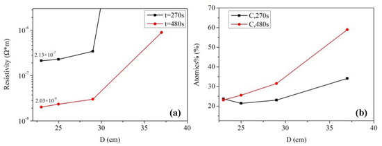 Electrical resistivity and carbon content of ultra violet (UV)-cured silver films based on MOD ink: (a) The electrical resistivity of silver films; (b) relative carbon content of silver films. D was defined as the distance between the samples and UV lamp.
