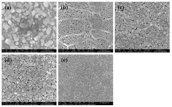 SEM images of silver films with UV curing at: (a) D = 37 cm for 270 s; (b) D = 23 cm for 270 s; (c) D = 23 cm for 480 s; (d) D = 25 cm for 480 s; (e) D = 25 cm for 480 s [20]. (a–d) were the films based on MOD ink while (e) was the film based on NP ink.
