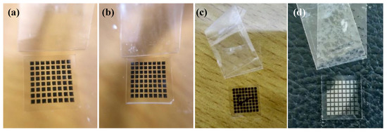 Photo of silver films based on NP ink after the tape test: (a) Heat cured in 80 °C for 30 min; (b) heat cured in 140 °C for 30 min; (c) UV cured at D = 37 cm for 180 s; (d) UV cured at D = 25 cm for 480 s.