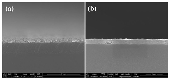 SEM images of the cross section of silver films based on NP ink: (a) Heat cured in 140 °C for 30 min; (b) UV cured at D = 25 cm for 480 s.