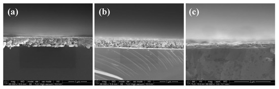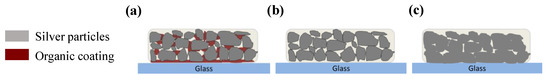 As shown in Figure 9a, many pores existed in the interface and most of the silver particles were not melted and merged into big particles when the film was cured in 160 °C. As the temperature increased to 180 °C, the size of the pores in the interface became smaller due to the melting of the particles shown in Figure 9b. Without the existence of the organic coating, the pores in the interface of the silver films based on MOD ink led to a poor connection between the films and substrates, as shown in Figure 7b. Consequently, the adhesion strength of the silver films cured in relatively low temperature was relatively poor. As shown in Figure 9c, when the film was cured at 200 °C, all silver particles were melted and no apparent pores were found in the interface, which indicated that the contacting area between the silver film and the substrate became larger and the connection between the film and the substrate became better. Therefore, the amount of the pores in the interface can be reduced by melting the particles in high temperature and a few pores meant a good connection between the films and substrates, leading to the good adhesion strength [28,29]. In addition, we speculated that a higher temperature could probably promote the mutual diffusion between silver films and substrates [30], which was needed to be proved in the future work.