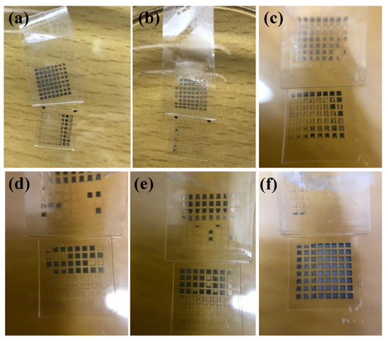 Photos of silver films based on MOD ink after the tape test: (a) UV cured at D = 37 cm for 480 s; (b) UV cured at D = 29 cm for 480 s; (c) UV cured at D = 23 cm for 480 s; (d) heat cured at 160 °C for 10 min; (e) heat cured at 180 °C for 10 min; (f) heat cured at 200 °C for 10 min.