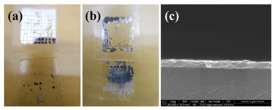 Photos of silver films deposited by DC magnetron sputtering after the tape test: (a) Heat cured at 100 °C for 10 min; (b) heat cured at 200 °C for 10 min; (c) SEM image of cross section of silver films heat cured at 200 °C for 10 min.