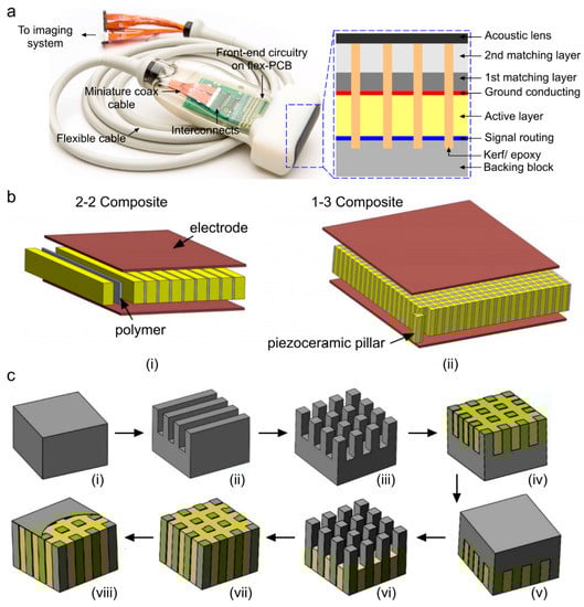 Geometric characteristics and manufacturing steps of a piezoelectric linear array ultrasound transducer. (a) A photograph of a piezoelectric ultrasound imaging probe; the cross-section of the sensing layer is provided in the blue dotted box [39], (b) structural difference between 2-2, 1-3 composite material when used in an ultrasound array transducer [62], (c) process flow of conventional dice and fill (DF) fabrication method using 1-3 composite and epoxy filling that includes: (i) piezoceramic material, (ii) dice in x direction, (iii) dice in y direction, (iv) epoxy filling, (v) reverse, (vi) backside dicing in x and y directions, (vii) 2nd epoxy filling, and (viii) deposit conductive layer. Reprinted with permission from [63].
