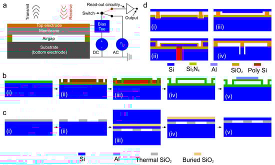 Capacitive micromachined ultrasonic transducer (CMUT) technology. (a) Schematic of a cross-section of a CMUT and its working principle, (b) steps of sacrificial release process: (i) substrate and insulation layer realization, (ii) sacrificial layer deposition and pattern, (iii) membrane layer deposition, (iv) sacrificial layer release, and (v) top electrode deposition, (c) steps of wafer bonding process: (i) thermal oxidation of silicon wafer (substrate), (ii) gap height and shape realization, (iii) bonding between silicon on insulator (SOI) and oxidized silicon wafer, (iv) thick silicon wafer etching, (v) buried oxide layer etching and top electrode realization [112], and (d) other CMUT designs fabricated using: (i) local oxidation of silicon (LOCOS) process [113], (ii) thick-buried-oxide process [114,115,116,117], (iii) mechanically coupled plate to the membrane [118], (iv) compliant post structure [114]. Reproduced with permission from [46].