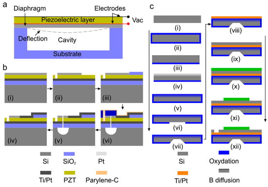 Piezoelectric micromachined ultrasound transducers (PMUT) technology. (a) Schematic of a cross-section of a PMUT and its working principle, (b) fabrication process flow of PMUTs with diaphragm defined by front-side etching method: (i) deposition of piezoelectric and electrode layer on top of oxidized silicon wafer, (i) SiO2, Ti, Pt, and PZT layer grown on silicon wafer, (ii) pattern top electrode, (iii) insulation pad deposition, (iv) Ti/Pt deposition, (v) etch through layers to realize bias, and (vi) release the front side diaphragm, reprinted with permission from [130], and (c) steps of backside etching method: (i) silicon wafer, (ii) wet oxidation, (iii) oxide etching, (iv) boron diffusion, (v) low temperature oxide growth, (vi) oxide etch, (vii) Si etch, (viii) Ti-Pt deposition, (ix) PZT deposition, (x) TiW-Au deposition, (xi) top electrode etch, and (xii) PZT etch. Reprinted with permission from [132].