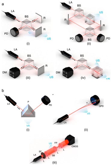 Optical ultrasound detection techniques. (a) Interferometric methods: (i) Michelson, (ii) Mach–Zehnder, (iii) doppler-based sensing, (iv) resonator-based sensing, and (b) refractometric: (i) intensity-sensitive detection of refractive index, (ii) single-beam deflectometry, (iii) phase-sensitive ultrasound detection. AL: acoustic lens, US: ultrasound, BS: beam splitter, D: detector, DM: demodulator, LA: laser, R: reflector, US: ultrasound, CMOS: complementary metal-oxide-semiconductor, FP: Fourier plane, L: lens, P: prism, PD: photodiode, QPD: quadrant photodiode, SB: Schlieren beam, SF: spatial filter. Reprinted with permission from [42].
