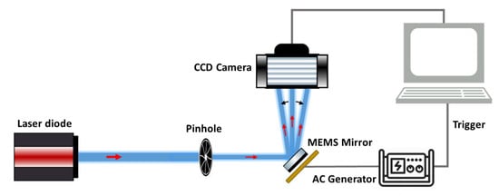 The obtained linearity of the OSA with the driving voltage ensures a constant Pixel Dwell Time (PDT) along a single scan axis. PDT is defined as the time that the laser beam rests on a single pixel and illuminates it. It characterizes the scanning speed of any scanning system. Therefore, the higher the PDT is, the higher the number of photons collected per pixel and vice versa. The PDTs for Y and X scanning axes were extracted using the videos of the displacement of the reflected laser beam recorded with the CCD camera (Figure 3). The MEMS actuators were driven by an AC generator, which provided a 2 V amplitude triangular wave-form signal with a 10 Hz frequency, while the CCD camera frame rate was set at 20,000 fps.
