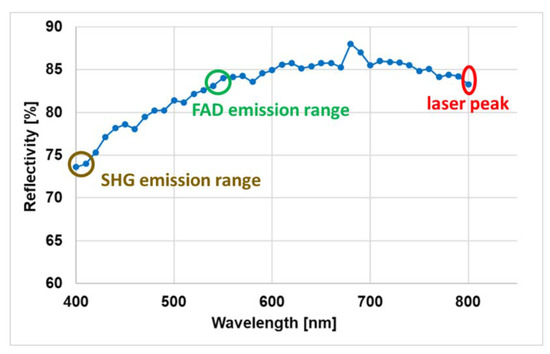Characterization started by investigating the spectral reflectivity of the mirror plate among a polychromatic signal wavelength range. Quantifying this parameter is required in order to calibrate the detected fluorescence emission spectrum so that accurate spectral fitting can be performed. The measured reflectivity in the wavelength range from 400 nm to 800 nm is plotted in Figure 4. The reflectivity at 800 nm, corresponding to the excitation laser, was found to be around 84%. In the collection mode, a similar reflectivity was found at 550 nm, which corresponds to the FAD emission peak [6], while it was found to be lower at 405 nm (74%), which corresponds to the SHG peak when excited at 810 nm. The wavelength range of the TPF signal excited using a 800 nm laser ranges from 400 to 700 nm.