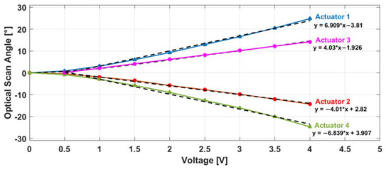 However, according to the simulations shown in Figure 1b, a 560-µm FOV only required a ±5° mechanical scan angle, corresponding to ±10° optical scan angle. This angle, and according to the fit equations, could be reached using 2 V as driving voltage for Y-axis scanning actuators (1 and 4) and at 2.95 V for X-axis scanning actuators (2 and 3).