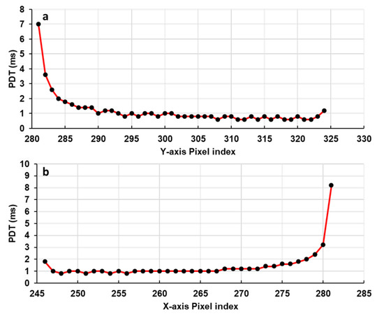 Measured pixel dwell time along a Y-axis scan line (a) and along an X-axis scan line (b).