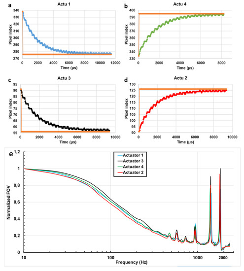 The dynamic responses of the MEMS mirror actuators. Step response of the MEMS mirror four actuators (a–d) in the rise phase (heating up). Frequency response of the four actuators (e) corresponding to the Normalized displacement of the beam (field of view, FOV) with the frequency variation at a fixed voltage of 1.5 V.