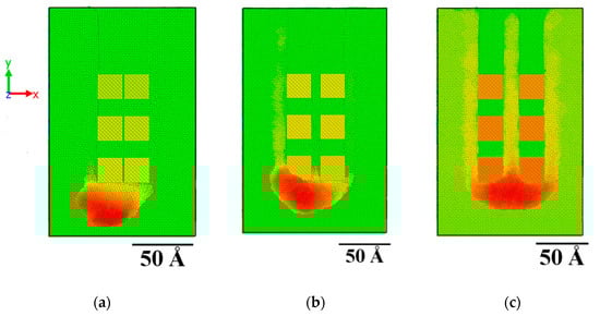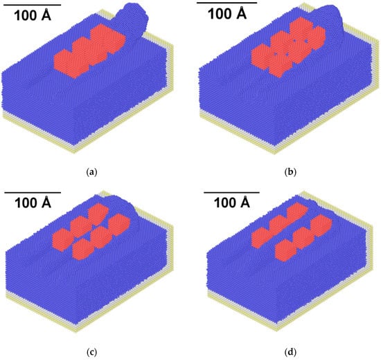 At first, it can be observed, from both Figure 2 and Figure 3, that due to the very close distance between the abrasive grains, a single groove is formed from the action of the two rows of abrasive grains, as their interaction with the workpiece material removes all atoms along their path, including atoms situated between them. As the spacing increases, gradually a zone of atoms is formed between the two rows, and for spacing values from 5a and beyond, two separate grooves exist. However, the chip produced by the material removal from both rows of abrasive grains is still common until spacing value exceeds 7a. In these cases, the chip produced by each row of abrasive grains is separate. Apart from the chip in the front of the abrasive grains, there is also an amount of atoms deposited on the area between the two grooves and on the sides of the grooves, especially in the cases with larger spacing.