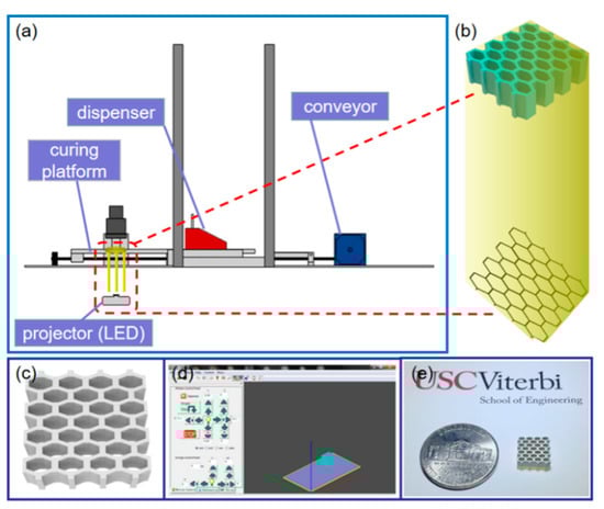 (a) Mask-Image-Projection-based Stereolithography (MIP-SL) system to print green parts. (b) Sliced 2D pattern of a 3D model projected by a digital light projector. (c) Computer-aided design model of the printed sample with honeycomb structure. (d) Graphical user interface of the MIP-SL system developed in-house. (e) Picture of the green part fabricated using the MIP-SL system.