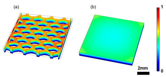To illustrate the advantages of printed ceramics, a finite element analysis was employed to demonstrate the ultrasound sensing process. Specifically, the performance of the composite honeycomb structure (Figure 2a) was compared with a solid single crystal structure (Figure 2b). The parameters of the sample were selected from the COMSOL material library. The density and piezoelectric constant were corrected according to the test results in order to mimic real conditions of the sintered sample. Both samples were 8.5 mm × 8.5 mm × 0.8 mm, and the simulation had a density of 5.96 g/cm3, a piezoelectric constant of 60 pC/N, a Young’s modulus of 67 GPa, and a 0.33 Poisson’s ratio. The epoxy in the composite structure had a density of 1.67 g/cm3, a Young’s modulus of 3.96 GPa, and a 0.33 Poisson’s ratio. The bottom of samples was mechanically fixed and connected to the ground. An ultrasound field at 1.6 MHz with the same intensity transmitting from top to bottom was applied to both samples. The distribution of ultrasound-induced piezoelectric potentials was calculated and plotted in Figure 2. The color bar represents the normalized ultrasound-induced electric potential distribution. It is shown that the generated piezoelectric potential in the honeycomb structure was about twice that of the solid brick structure. Thus, the honeycomb structure can perform better than solid structures. The application of the proposed honeycomb structure for high-sensitivity ultrasound sensing deserves to be studied further.