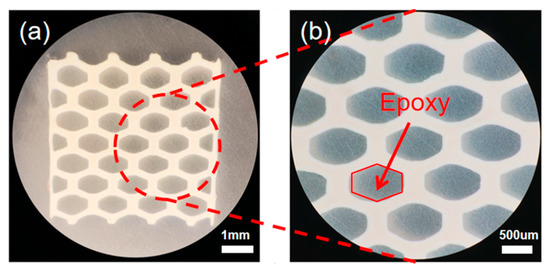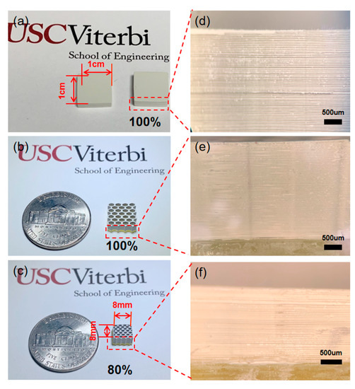 BaTiO3 green part samples with a brick structure, using 100% and 80% ratio sizes of a honeycomb structure, were built via the MIP-SL system (Figure 1a). Figure 3a–c shows images of the 3D-printed piezoelectric green parts. The size ratio refers to the proportion of a different structure’s basal side length to the basal side length with a fixed basal area of 1 cm × 1cm. One hundred percent size ratio samples gained the designed shape with the basal area size of 1 cm × 1 cm, while 80% size ratio samples obtained shapes with the basal area size of 0.8 cm × 0.8 cm. Each hole of the structure (100% ratio) was defined by a hexagon with side length 800 μm, and the wall thickness of the structure was 450 μm. Figure 3d–f shows the layer details of the samples under the microscope with a scale bar of 500 μm. Each sample had a dense structure made by the MIP-SL system. However, due to the limited Z curing depth and XY resolution of the MIP-SL system, layers of the 80% size ratio sample had small gaps and were not perfectly dense. Furthermore, the brick structure sample showed obvious cracking during the sintering process due to the internal stress of the brick structure. Hence, the small holes of honeycomb structure were then filled with epoxy after the sintering process to construct the required piezoelectric composites for further study.
