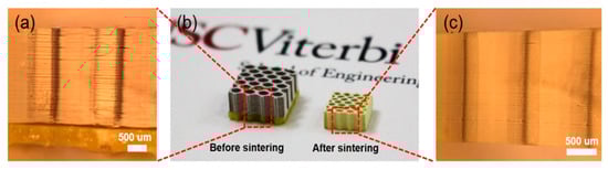 Figure 4b shows that the whole size of the sample (100% ratio) became smaller after sintering. The sintered sample size became 8.5 mm × 8.5 mm. In particular, comparing Figure 4a,c, few gaps existed after the photocured resin was removed from the structure during the debinding process. The layered structures became denser after sintering. To compare with pure BaTiO3, Table 1 shows the density of BaTiO3 ceramic samples measured using Archimedes’ principle before and after sintering [42]. The density of the printed samples after sintering increased significantly, indicating the 3D-printed BaTiO3 ceramics converted to dense bodies during the sintering process.