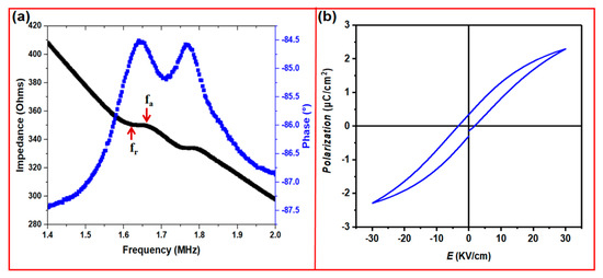 (a) Impedance and phase angle spectrum of the sputtered sample. (b) Polarization-electric field (P-E) hysteresis loop of the sputtered sample.