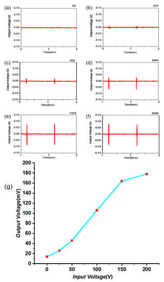 Output voltage amplitudes of the device over time for different input voltages of (a) 0 V; (b) 25 V; (c) 50 V; (d) 100 V; (e) 150 V; and (f) 200 V; (g) Trend of the output voltage.