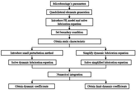Figure 2 shows the flow chart of solution and the solution process can be described as: The numerical model calculation domain was constructed firstly according to the parameters of the microbearings in Table 1, then the calculation domain was discretized into quadrilateral elements and all the nodes and elements information of the mesh were obtained. For the static calculation, the coefficients matrix was assembled by FEM [31]. The periodic symmetry boundary condition and the Dirichlet boundary condition were applied to the corresponding boundary. The Newton–Raphson method was applied to gain the numerical nonlinear solution of equations iteratively and then the distribution of the dimensionless pressure distribution was obtained. Numerical integration was adopted to acquire various static parameters. Based on the static results, the dynamic characteristics of microbearings could be obtained using the small perturbation method. Then the PDE (partial differential equation) was solved and the distribution of each partial derivative in the solution domain was obtained. Furthermore, numerical integration and coordinate system transformation were adopted to obtain the dynamic characteristic coefficients of the bearing in the standard solution coordinate system. The configuration of the workstation used for calculation was Intel(R) Core(TM) i5-9400f CPU@2.90GHz, RAM 32G, and the cumulative calculation time was 54 h.