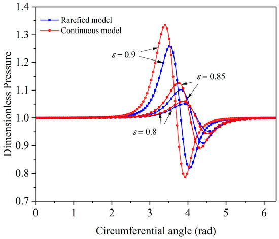 Figure 3 shows the circumferential pressure curve of a micro gas bearing under the condition of the rarefied flow and continuous flow model. Under different eccentricity ratios, the maximum dimensionless pressure of the rarefied flow model decreased compared with the continuous flow model, and the position of the maximum pressure moved in the positive circumferential direction, indicating that the influence of the rarefaction effect on the bearing performance was not negligible for the gas-lubricated microbearings.
