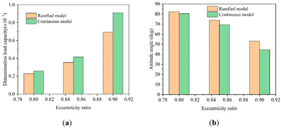 Figure 4 shows the load capacity and attitude angle under three different eccentricities solved by the continuous flow and FK model, respectively. For high-speed gas bearings, when the rated eccentricity ratio of the bearing changed from 0.8 to 0.9, load capacity increased rapidly, the attitude angle decreased and the influence of the rarefaction effect became increasingly obvious. When considering the rarefaction effect, the load capacity of the bearing was reduced, and the attitude angle increased slightly, which implied that the stability of the microbearings was weakened.