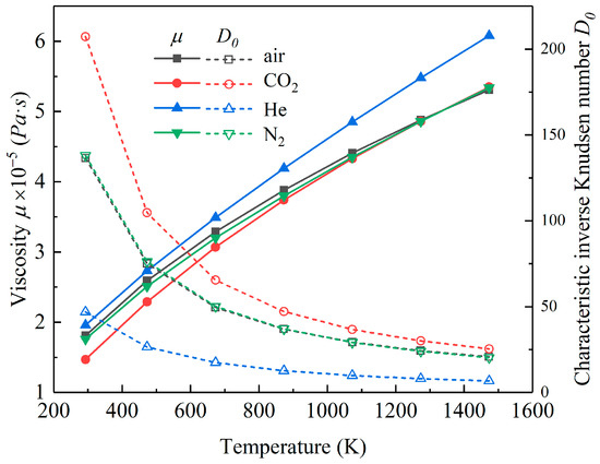 Figure 5 shows the variation of the dynamic viscosity and characteristic inverse Knudsen number of the four kinds of typical gas studied in this paper at different temperatures.