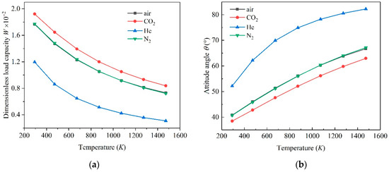 Figure 6 shows the influence of temperature on the load capacity and attitude angle of microbearings lubricated by four kinds of gas. In general, when the temperature increased, the load capacity showed a decreasing trend at different temperatures. The load capacity of microbearings lubricated by CO2 was the largest, while by He was the smallest. The variation of load capacity for gas bearing lubricated by N2 and the air were similar in all temperature cases. For the attitude angle, as the temperature increased, the attitude angle of gas bearing showed an increasing trend, especially for gas bearing lubricated by He (more than 80° at 1473K), which meant the microbearings worked under the condition of low stability. For CO2 bearings, the attitude angle was the smallest at each temperature, while the attitude angle of air and N2 bearings were always similar in value and change trend.