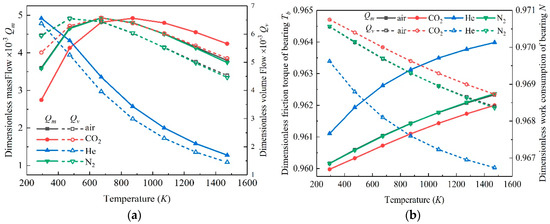 Figure 7 shows the influence of temperature on gas flow, friction torque and friction work consumption of microbearings lubricated by four kinds of gas. For air, N2 and CO2, as the temperature increased, the dimensionless mass flow rate and volume flow rate of showed an increasing trend and then decreased, while for He, the dimensionless mass flow rate and volume flow rate showed a decreasing trend. For the dimensionless friction torque of the microbearings inner surface, as the temperature rose, it showed an increasing trend, and the dimensionless friction torque of He was the largest, while the dimensionless friction torque of the CO2 was the smallest. The dimensionless friction work consumption was the opposite. In the four cases, the dimensionless friction work consumption showed a downward trend, and the friction work consumption of CO2 was the largest.