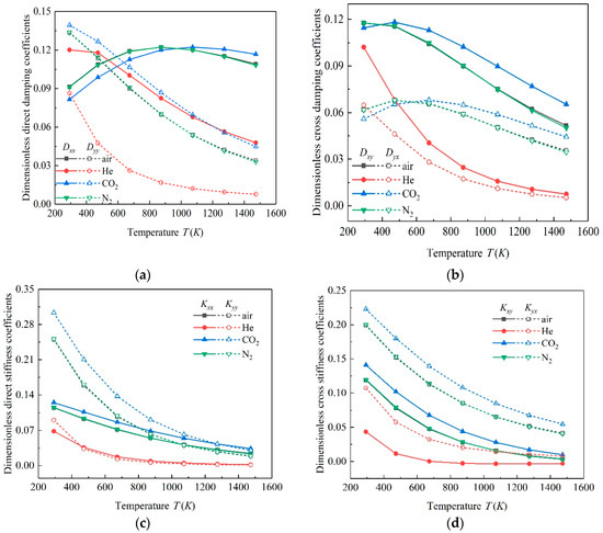 When the temperature range was between 293 and 1473 K, for air, N2 and CO2, Dxx increased first and then decreased with the increase in temperature, while for gas bearing lubricated by He, Dxx decreased. Dyy decreased in all the cases with the increase in temperature. Dxy decreased for all the cases generally, but for CO2 gas bearing, Dxy increased slightly when temperature changed from 293 to 473 K. Dyx decreased for microbearings lubricated by He, while the other three showed a slightly upward trend in the temperature range of 293 to 500 K, and then decreased. As for the dimensionless stiffness coefficients, the values of Kxx, Kyy, Kxy and Kyx showed a downward trend in all cases, and their values were positively related to the molecular mass of the gas. That is, the dimensionless stiffness coefficients of CO2 gas bearing were the largest, while those of He were smaller in general.