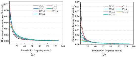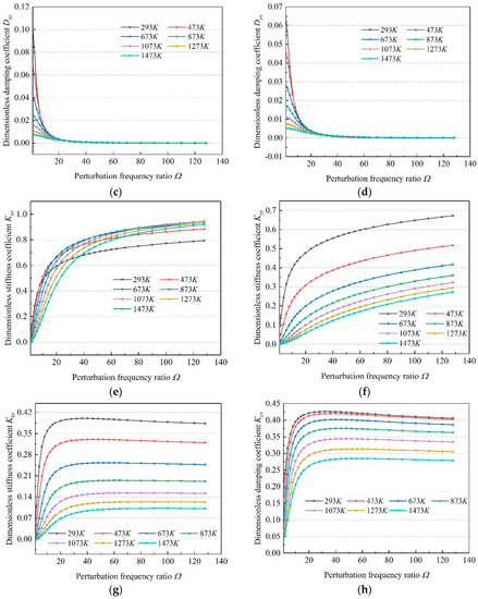 Figure 10 shows the change curves of eight dynamic coefficients of microbearings lubricated by air when Ω from 2−7 to 20 at different temperatures. Eight coefficients of the microbearings tended to a fixed value, respectively, as Ω approached zero, and they tended to be different at different temperatures. For Dyy|Ω→0 and Dyx|Ω→0, when the temperature was 293 K, the corresponding coefficients values reached the maximum, respectively, and when the temperature was 1473 K, the corresponding coefficients values reached the minimum, which indicated that Dyy|Ω→0 and Dyx|Ω→0 decreased with the increase in temperature. For Dxx|Ω→0, the coefficient value increased with the ascending of temperature. When the temperature was 293 K, Dxx|Ω→0 reached the minimum, and when the temperature was 1473 K, Dxx|Ω→0 reached the maximum. For Dxy|Ω→0, when the temperature was 473 K, the coefficient value reached the maximum value, and when the temperature was 1473 K, the coefficient value reached the minimum value. For the four dimensionless stiffness coefficients, Dyy|Ω→0, Dyx|Ω→0, Dyy|Ω→0 and Dyx|Ω→0, the maximum value was obtained at 293 K, and the minimum value was obtained at 1473 K, indicating that with the increase in temperature, the four dimensionless stiffness coefficients showed a downward trend.
