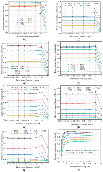 Influence of temperature on the 0 dynamic limit coefficients. (a) Dxx; (b) Dyy; (c) Dxy; (d) Dyx; (e) Kxx; (f) Kyy; (g) Kxy; (h) Kyx.