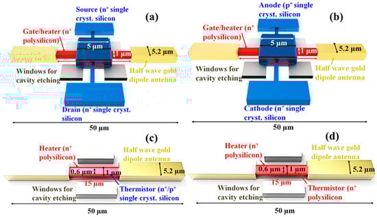 Bolometers without an antenna of the present work were fabricated by the standard Si CMOS technology instead of the complex non-standard lift-off process used in our previously reported works [44,45]. The key advantages of the Si CMOS technology are good reproducibility and universalities of the results. For the purpose of evaluating the temperature sensor in an antenna-coupled design, the novel high performance antenna-coupled metallic microbolometer structure on a high-resistivity Si substrate for sensing at around 1 THz was adopted. This limits an integrated sensor/heater area to be 15 × 15 µm. The minimum feature size of 0.6 µm is used in the present CMOS fabrication technology. Based on the measurement results of the fabricated device, the performance of the assumed device was estimated under the constraints of the antenna-coupled design at 1 THz and the 0.6-μm design rule. The structures of the assumed devices with its dimensions are shown in Figure 1, where a half-wave gold dipole antenna is directly coupled at both ends of the heater. The dimension of polycrystalline heater is commonly set for all the bolometers. An insulation layer stacked between an integrated sensor/heater is located at the center of an antenna, and it is suspended above the cavity in the Si substrate. The temperature sensor is electrically separated, but thermally connected with the heater. Figure 1a,b represents the assumed design of n/p-channel MOSFET and undoped/p- body doped pn-junction diode bolometers, respectively. In MOSFET and diode bolometers, an additional lead with the length of 5 µm is connected on each side of its gate electrode, and it is extended towards the antenna. The gate electrode together with the lead serves as a heater. The thickness of the gate oxide, gate polysilicon, SOI, and buried oxide (BOX) are 7, 130, 100, and 200 nm, respectively. Figure 1c,d demonstrates the assumed structure of resistive bolometers with a n+/p+ single crystalline silicon thermistor and n+ polysilicon thermistor, respectively.