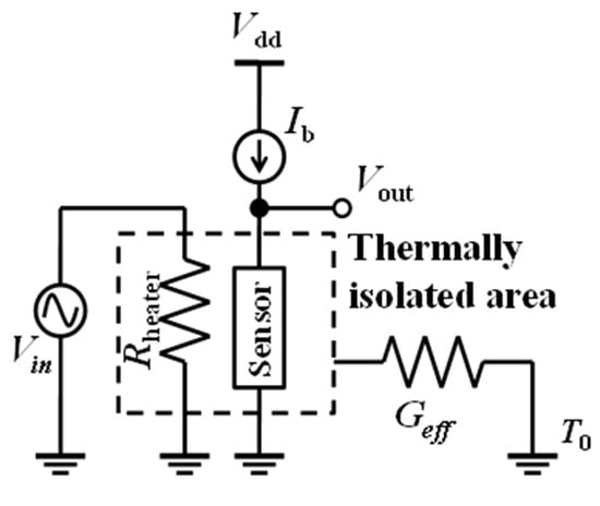 Figure 2 represents the electrical circuit for Rv estimation. Rv is the measure of output voltage at the temperature sensor for the corresponding applied sinusoidal input power (Pin) at the heater under constant Ib [46]. The structure and dimensions of MOSFET and diode bolometers are assumed to be the same, a similar measnuremental technique and modeling was used to calculate Rv. The temperature dependence of output voltage (ΔVout/ΔT) was measured using a low-temperature prober Nagase Techno-Engineering Grail 21-205-6-LV-R and the Semiconductor Parameter analyzer Agilent 4156C on the fabricated devices. However, for diode bolometers the conversion has to be done on the measured results due to the variations in the device dimension. The conversion on measurement results were performed by considering the proportionality of the current to the aspect ratio (W/L). Temperature dependence of the heater input power (ΔT/ΔPin) was determined by implementing analytical modeling [47]. The parameters required for analytical modeling were extracted from the measured electrical characteristics. The measured and calculated electrical and thermal parameters are shown in Table 2. Parameters used in the analytical model are electrical resistance (re), thermal resistance (rt), and TCR (α) of the polysilicon heater stacked with an SiO2 insulation layer, and thermal conductance of the source/drain or anode/cathode lead (Cc).