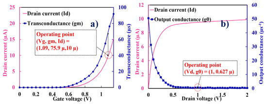 (a) Extraction of the transconductance (gm) from drain current vs. gate voltage characteristics; (b) extraction of the output conductance (g0) from drain current vs. drain voltage characteristics. As an example, characteristics of the n-channel MOSFET with L = 1 μm and W = 5 μm are shown. Vd = 1.00 V for (a), and Vg = 1.09 V for (b).