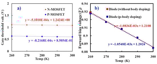 (a) Temperature dependence of the gate threshold voltage (MOSFET bolometer), and (b) temperature dependence of the forward bias voltage (diode bolometer).